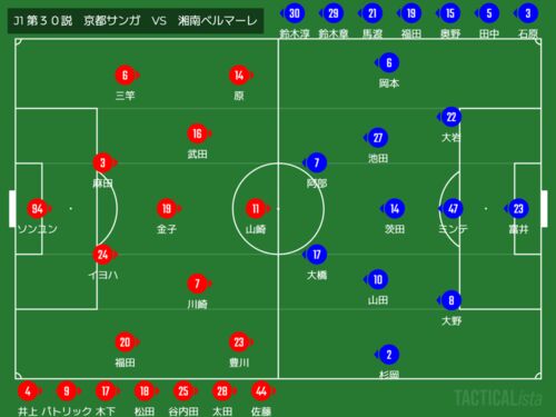 京都にとっては勝てばJ1残留の確定する大事な試合となった湘南戦。試合間隔が3週空くという珍しい日程となったが、一方で試合に向けての課題がはっきりとしていた。 京都が解決しなければいけない課題は2つ。 ・湘南の3142に対して、京都の4123を…