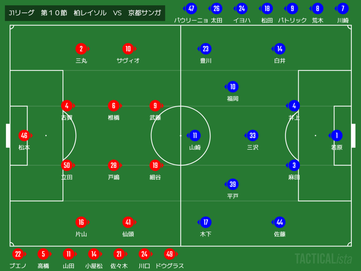 3バックへの変更により柏ツートップの脇で前を向くイヨハが起点となる。また、3トップの三人が役割を入れ替える事でライン間で前を向くことにも成功していた。守備でも3バックにすることで、柏FWへ思い切り当たることが出来るようになった。可能性を感じる崩しが何度も出てくるようになり、システム変更により完全に京都が息を吹き返しす。