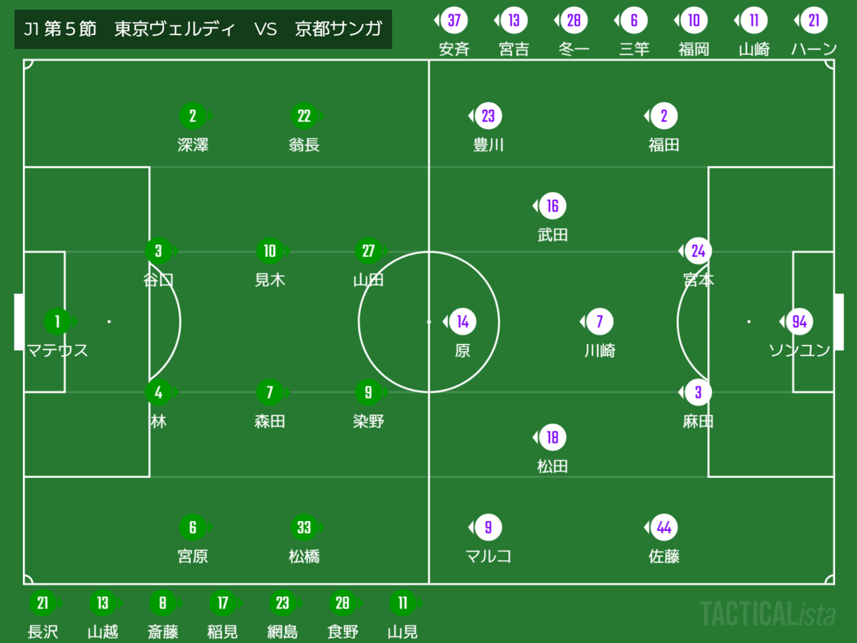 ・ヴェルディのビルドアップに対する京都のプレッシングが試合の流れを引き寄せました。ヴェルディはキーパーを使ってビルドアップをしてくるチームなのですが、GKを使っても京都のハイプレスをかわせず、ボールを前進させるだけでも四苦八苦。面白いように京都のハイプレスがハマります。