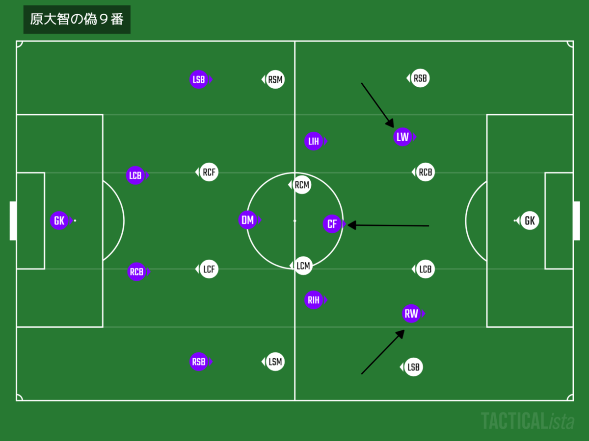 第3節以降、しばらくの期間、京都らしくないと言ってはなんですが、ポゼッションを重視した試合を模索していくことになります。具体的には偽9番システムです。偽9番とは、通常は最前線にポジションを取るFWが中盤まで位置を下げることにより数的優位を作り、ボール保持を安定させる戦術です。この重要な役割を原大智に託しました。