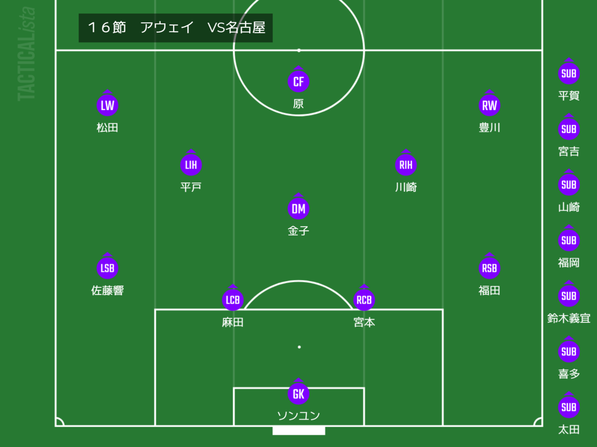 名古屋戦のスタメンはこの通りなんですが、選手配置というよりは試合内容が変化します。これまでずっと取り組んでいたビルドアップ&ポゼッションを完全に捨て去っていました。ゴールキックや後方からのビルドアップでは、ほぼ原大智へのロングボールが送られるようになります。そして、なるべく相手陣地にボールがある時間を増やすように、中途半端なボールはすぐさま相手陣内に蹴り返す、といった具合です。相手陣地にボールがあることを重視するのはラグビー的な発想ではありますが、サッカーでもそれなりに有用な考え方ではあります。それよりもっと重要だったのが、チーム全体の意思統一だったのでしょう。特に中盤の選手達の影響が大きかった様に思います。ポゼッションをするためには、中盤の選手はボールを引き出すために下がり気味に位置取りをする必要があります。一方でハイプレスを仕掛けてこぼれ球を拾うことを第一に考えると前目にポジションを取らなければならない。どっちつかずのポジション、どのプレーも上手くいかない、相反する事象に対して自由を与えられた選手がどうしてよいか困る場面が泥沼期間中には多く見られました。ロングボールを送り込むことや、相手陣地にボールがある時間を増やす、という方針決定は、当然相手のボール保持の時間を増やしますが、京都の選手達にとっては判断が楽になります。実際、名古屋戦から京都の生命線である判断の早さが選手たちに戻ったようにも感じました。